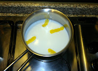 Versare il latte in una casseruola assieme all’aroma scelto (per me scorza di limone) e scaldare fino a far fremere.