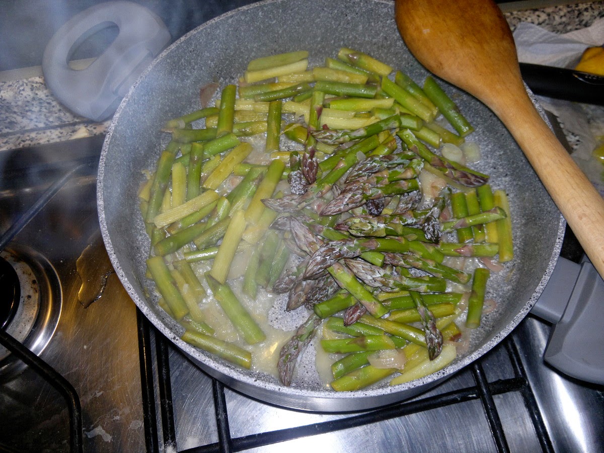 Aggiungete la scorza di limone tagliata a julienne e unite gli asparagi.