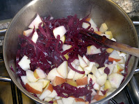 Then slice onion and brown it in a pot with the oil. Add cabbage with all the marinate and cook covered for about 1 hour, stirring often. When 5 minutes of cooking are left add the apples, chopped in cubes with the peel.