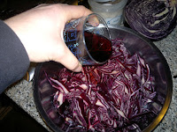Slice thinly the cabbage and put it in a bowl. Add wine, vinegar, cloves, cinnamon, bay leaf. Mix, cover and set in the fridge for 12 hours.