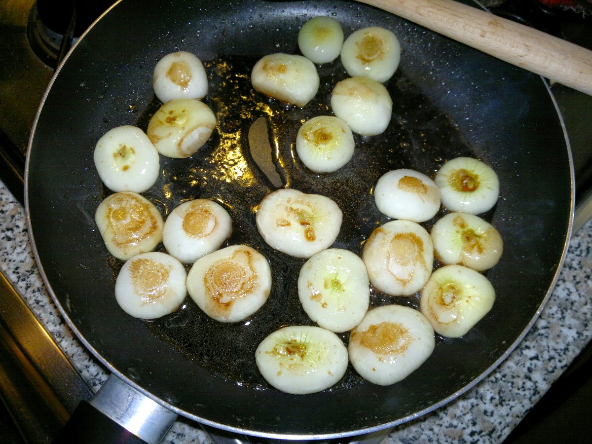 Mettete l’olio in una padella e scaldatelo. Unite quindi le cipolline e rosolatele un paio di minuti.