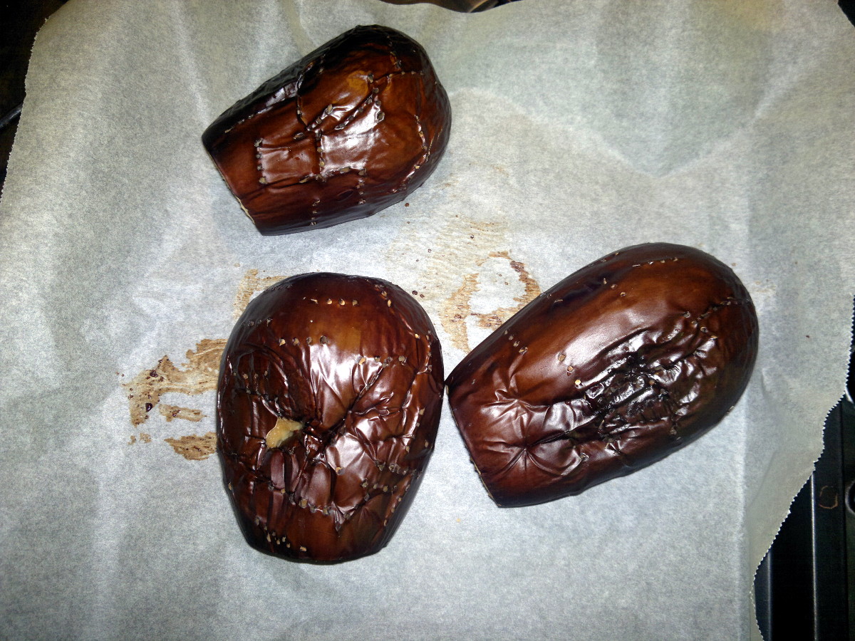 Using a fork riddle the eggplants with holes and place them on the oven tray lined with parchment.