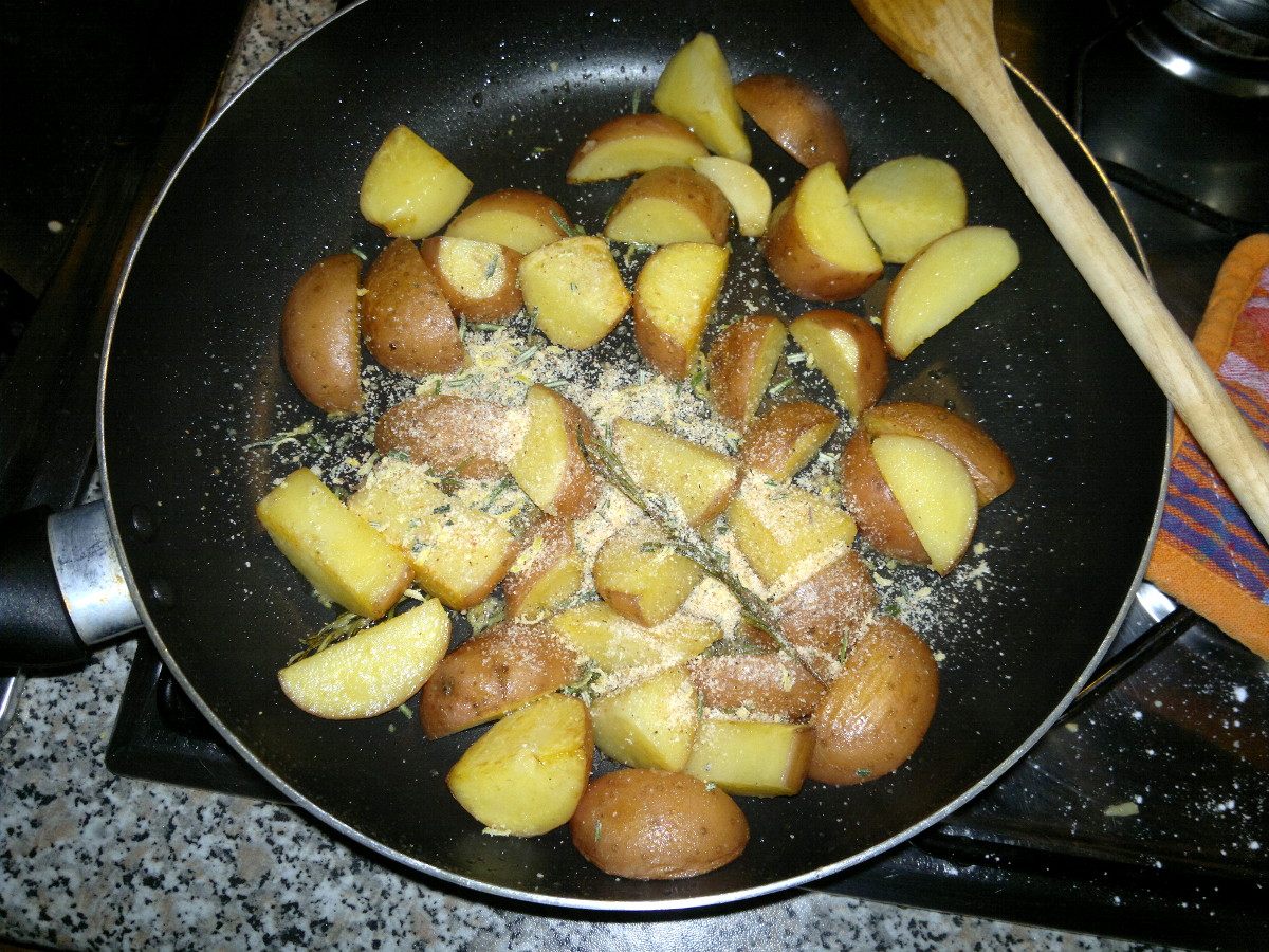 In a fry-pan warm-up oil and add one garlic clove’s. Add potatoes, some rosemary and cook, stirring time by time until they’re tender.