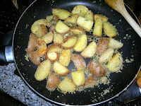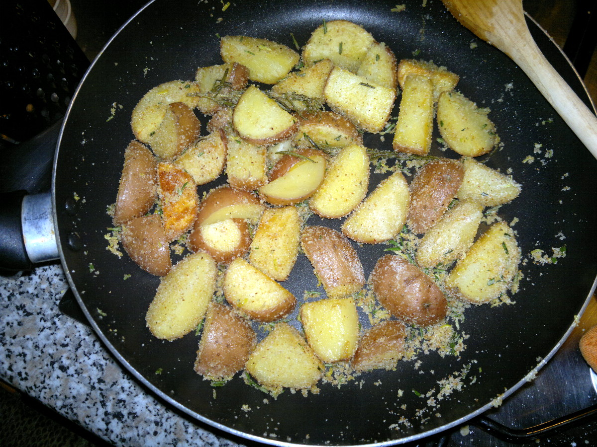 In una padella scaldate l’olio e rosolatevi uno spicchio d’aglio sbucciato. Aggiungete le patate e un rametto di rosmarino e cuocetele, mescolando di tanto in tanto, finchè non saranno tenere.