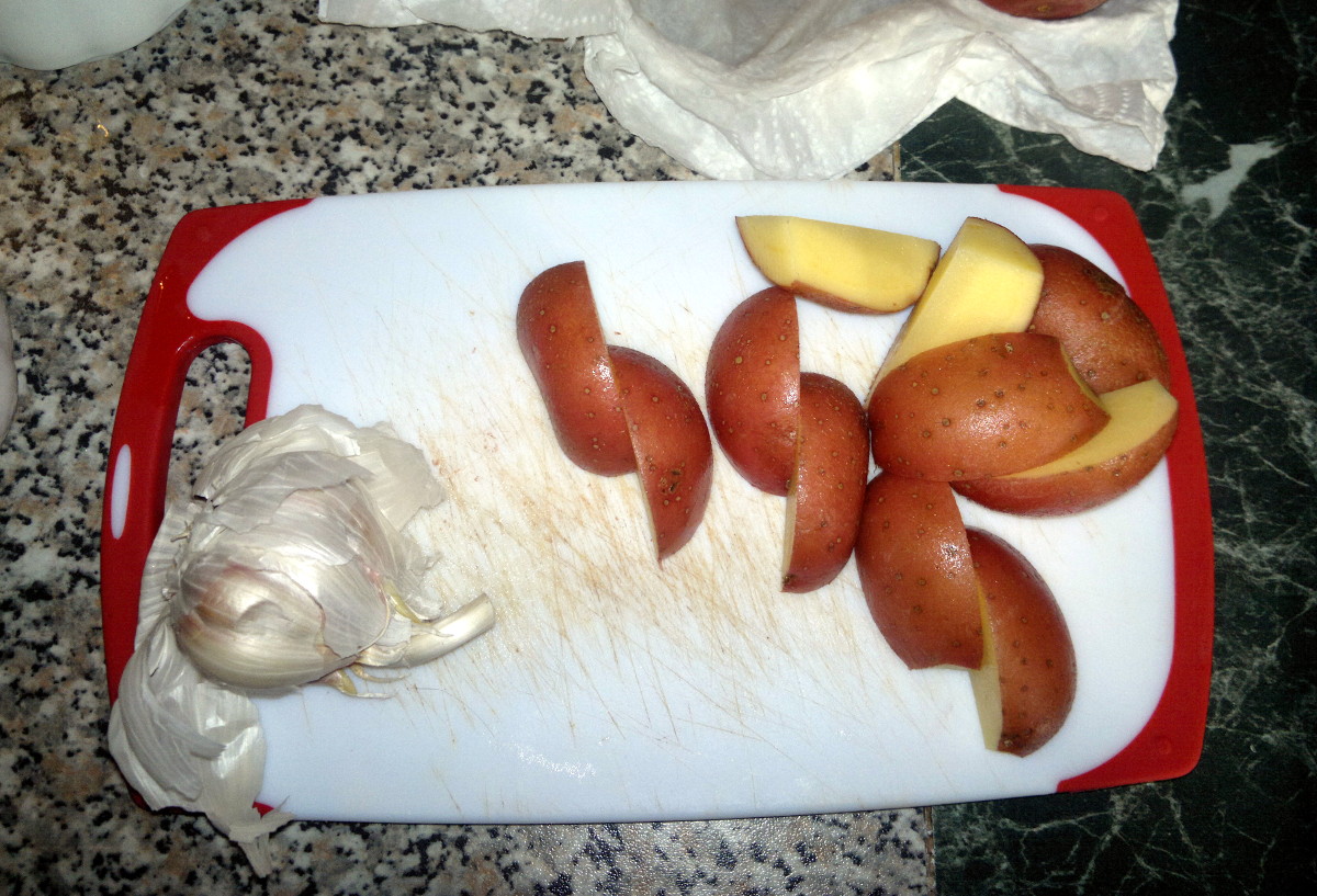 Lavate accuratamente le patate, asciugatele e tagliatele in tre o quattro pezzettoni.