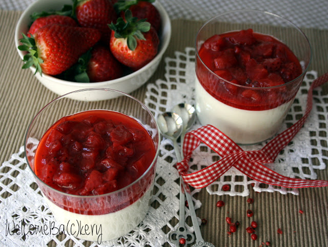 Meanwhile prepare the compote. Wash strawberries and chop them. Put strawberries in a little pot with sugar, lemon juice and mashed pink pepper berries.