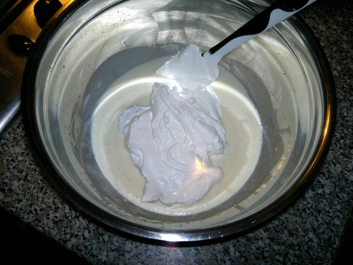 Montate ora i 180g di panna rimanente e incorporatela al tutto, con movimenti dal basso verso l’alto.
