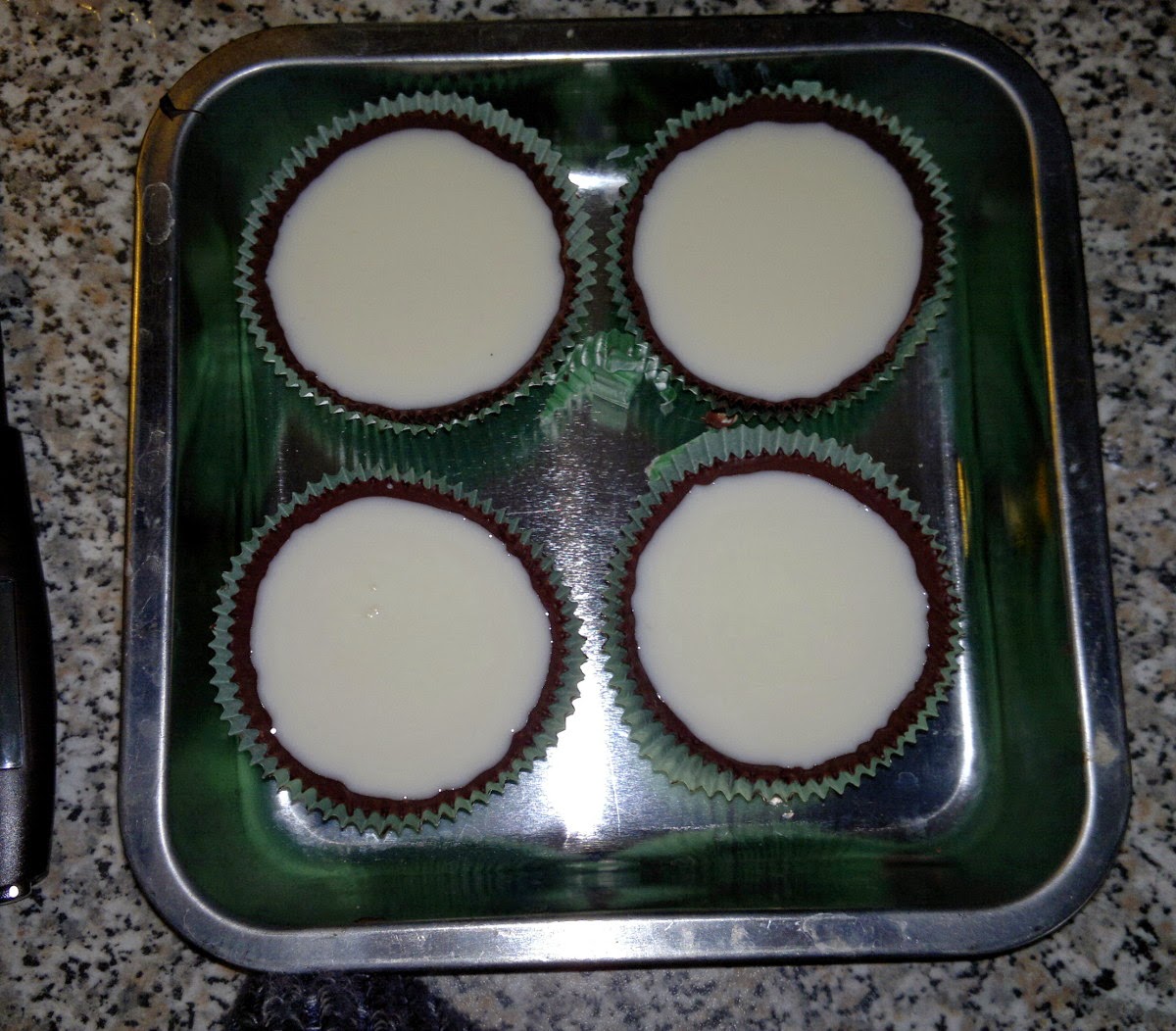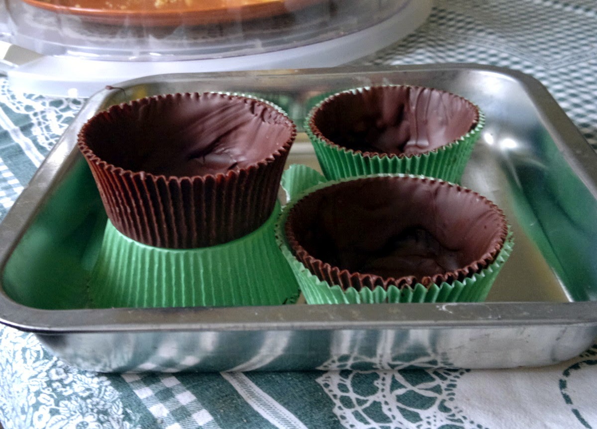 First prepare the shells. Melt the chocolate and cover with a brush 4 paper mold for muffins. When the chocolate is solidify brush with melt chocolate again. If is necessary do this operation again.