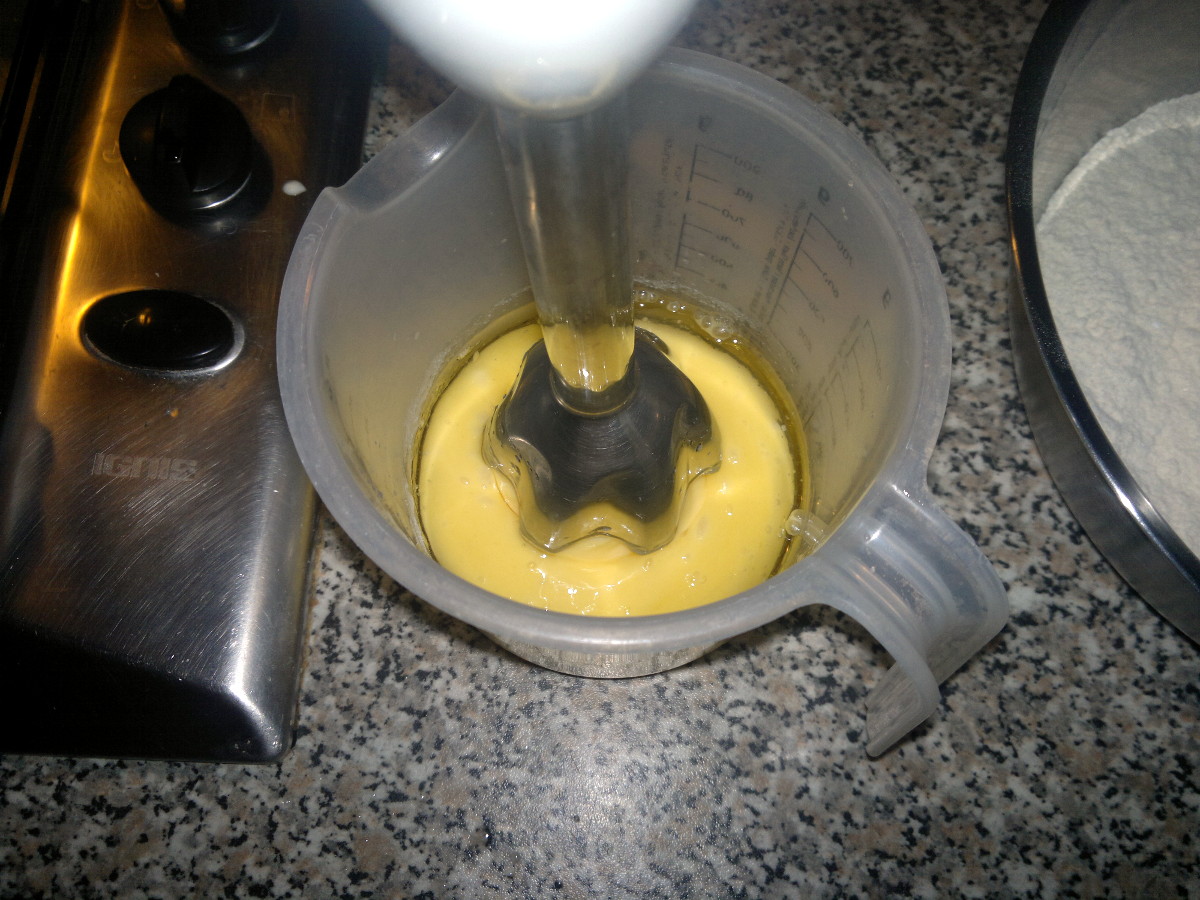 In una caraffa mettete le uova, l’olio, la vanillina, il succo di limone e un pizzico di sale. Con il frullatore ad immersione lavorate il tutto finchè non si sarà emulsionato e non avrete una sorta di crema.