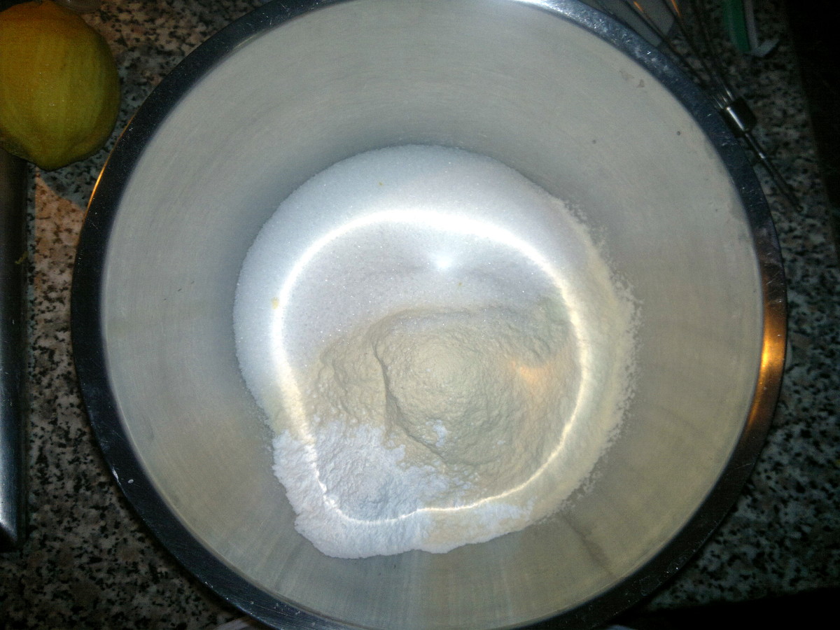 In a glass put the eggs, the oil and the lemon juice. Mix with an hand blender until you’ll have a sort of cream. Pour this cream over the flours and add the milk.