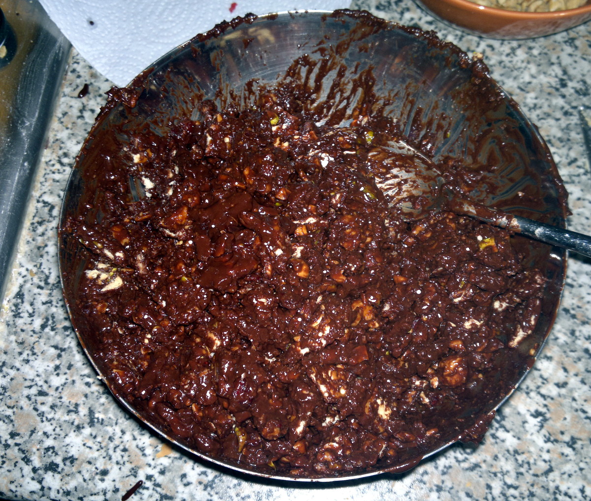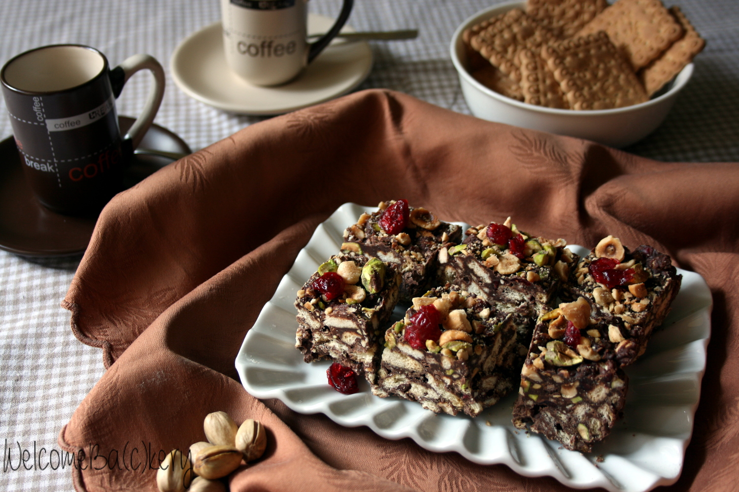 Pour over the biscuits mix and stir well. Now pour it all in a 20×20 pan, lined with greaseproof paper. Sprinkle with the remaining hazelnut and pistachios and set in the fridge for a few hours. Then cut in cubes and serve.