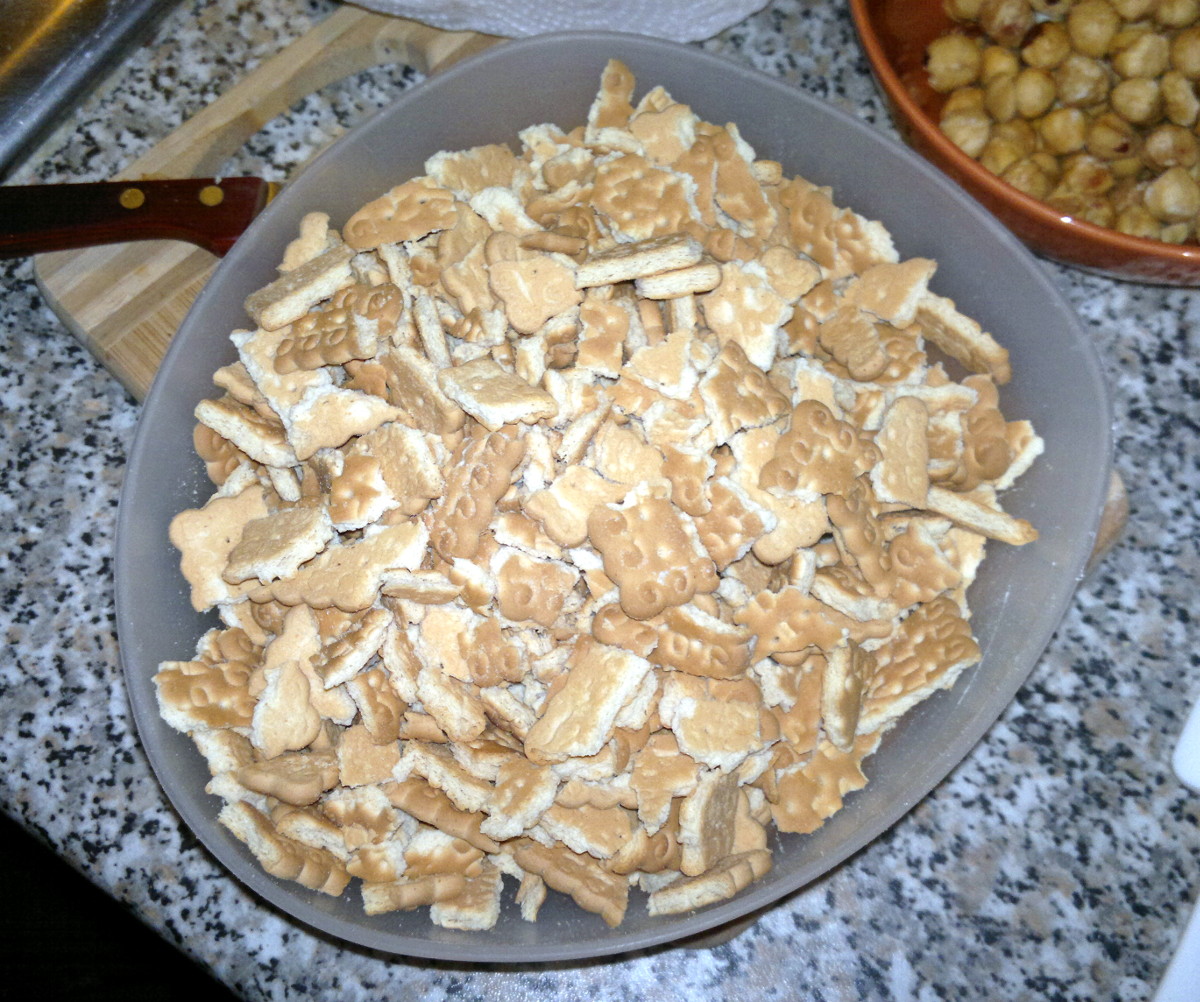 Versatelo sul mix di biscotti e frutta secca e mescolate bene.
