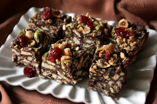 Dei quadratini resi golosi dal cioccolato, croccanti dai biscotti e la frutta secca con in più la nota acidula e colorata dei cranberry.