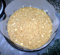 Rivestite lo stampo con carta forno (io fodero prima il fondo, incastrando la carta sotto l’anello, e poi i bordi ritagliando una striscia di carta e facendola aderire alla parete con un po’ di burro) e versate il composto sul fondo, premendo bene col dorso di un cucchiaio per compattare.