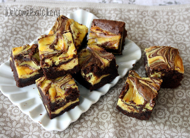 Versate metà dell’impasto al cioccolato dentro la teglia foderata, facendolo arrivare anche negli angoli. Distribuite 4-5 cucchiaiate di impasto cheesecake sulla superficie equidistanti tra loro e coprite con l’altra metà dell’impasto dei brownies. Distribuite altre 4-5 cucchiaiate di impasto cheesecake sulla superficie dei brownies  Passate la punta di un coltello non affilato sulla superficie dei due impasti, mescolando grossolanamente per ottenere l’effetto marmorizzato.
