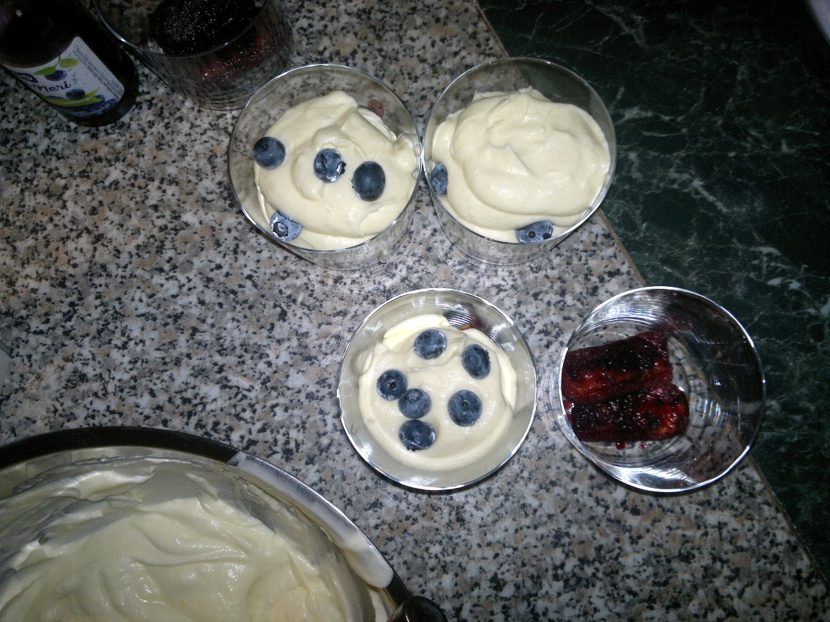 Mettete un po’ di crema sopra i savoiardi, qualche mirtillo fresco e poi ancora crema.