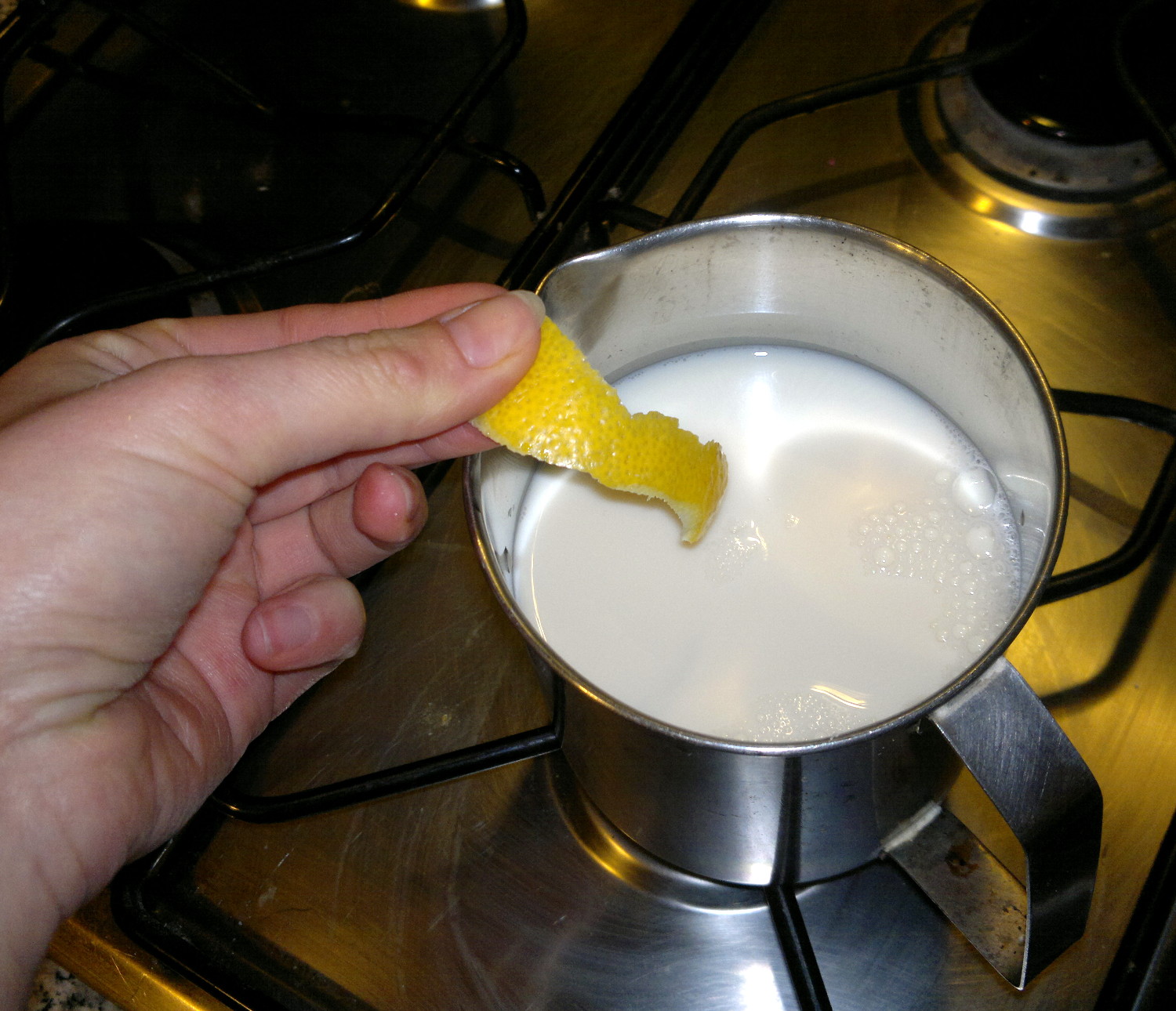 Scaldate il latte fino a sfiorare l’ebollizione, unite la scorza di limone e lasciate in infusione una ventina di minuti.