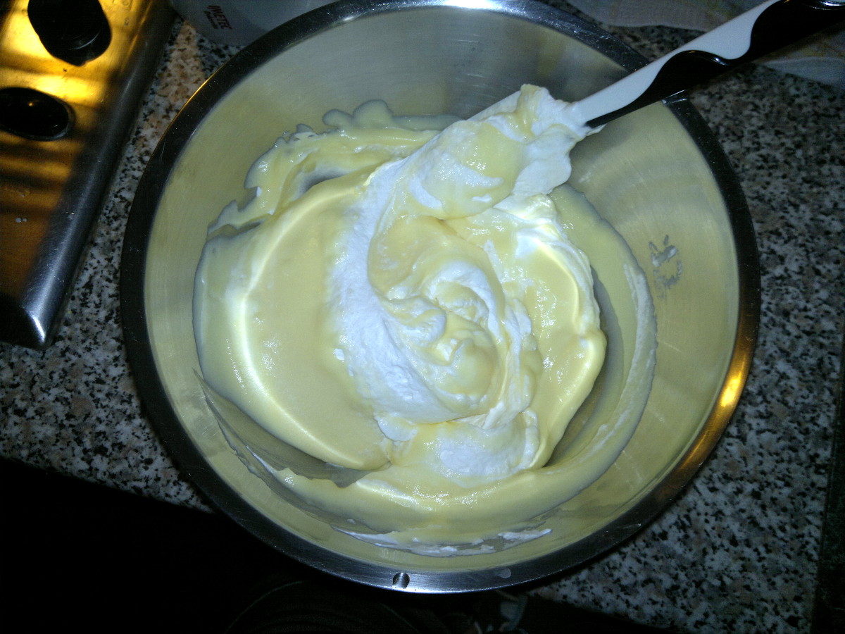 Then whip the milk cream and add it to the custard, stirring lightly from bottom to top.