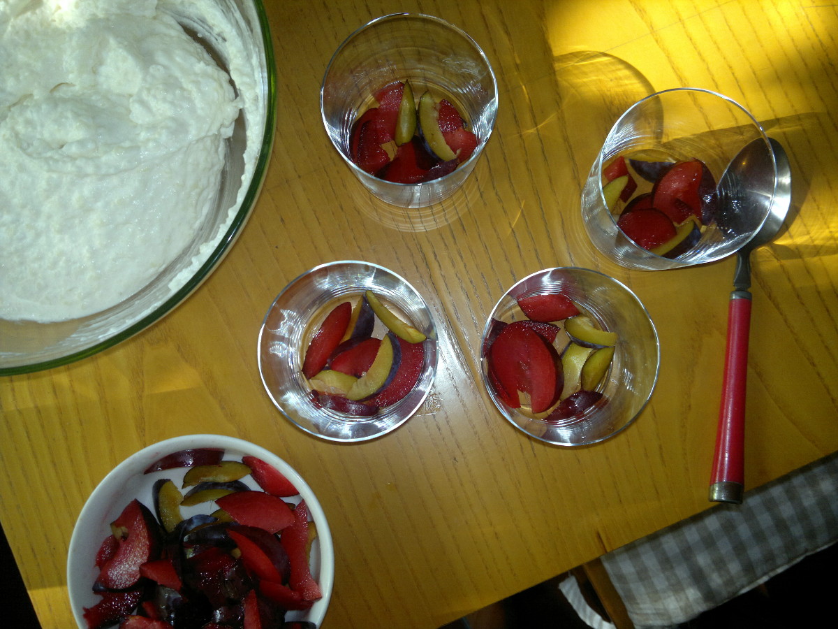 Wash and stone the plums, slice them and arrange a bit of them on the bottom of 4 glasses. Now add some rice cream, then again the plums and so on, until the ingredients are over. Let rest in the fridge for at least 1 hour, then serve.