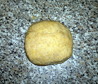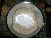 Mix in a bowl the flours with the baking powder. Cut the cold butter in little cubes and using your fingers’ tip mix it to the flour, until you have a bread-crumbs like mix.