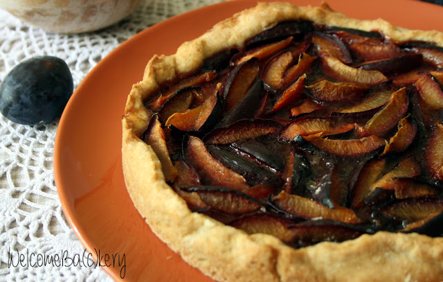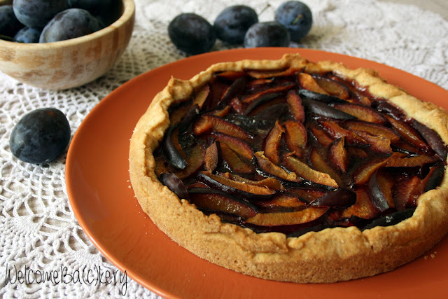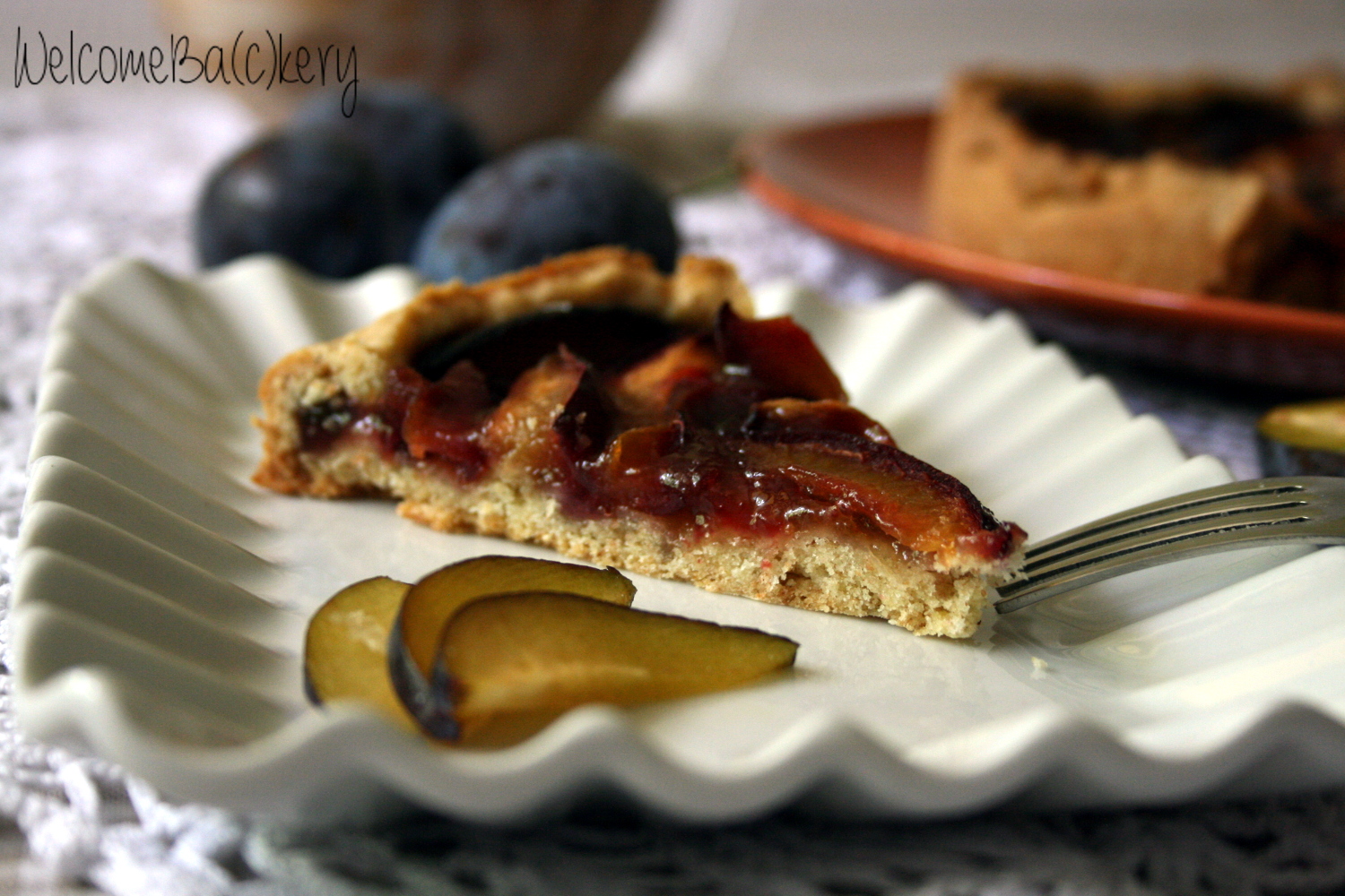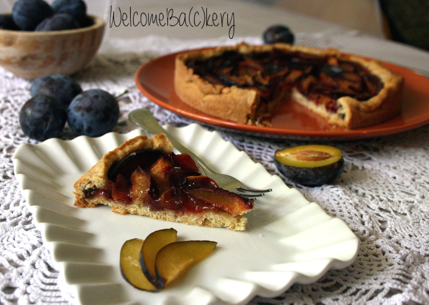 Una semplice crostata, di cui ho insaporito la frolla con farina integrale, uno strato di confettura vivacizzata dallo zenzero – che con le prugne fa una coppia perfetta – e tante prugne fresche sopra!