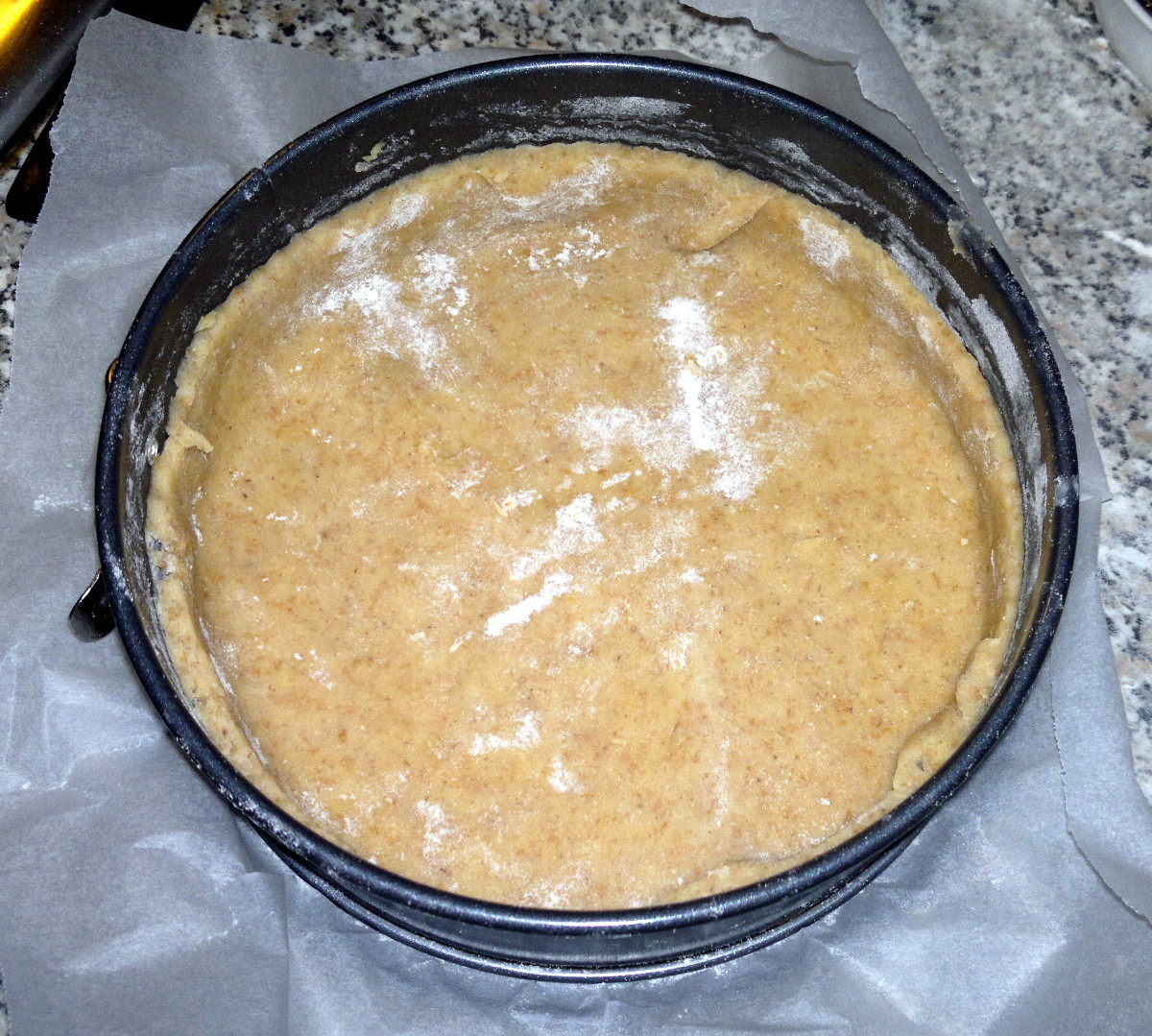 Riprendete la frolla dal frigo e stendetela col mattarello ad uno spessore di circa 3 mm. Foderate con essa lo stampo, tagliate i bordi e bucherellate il fondo con una forchetta.