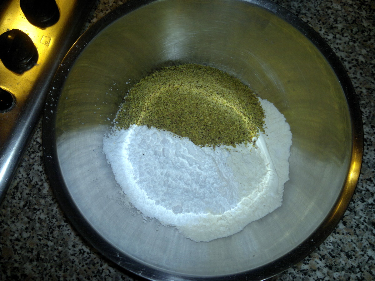 Setacciate la farina in una ciotola e aggiungete la farina di pistacchi,