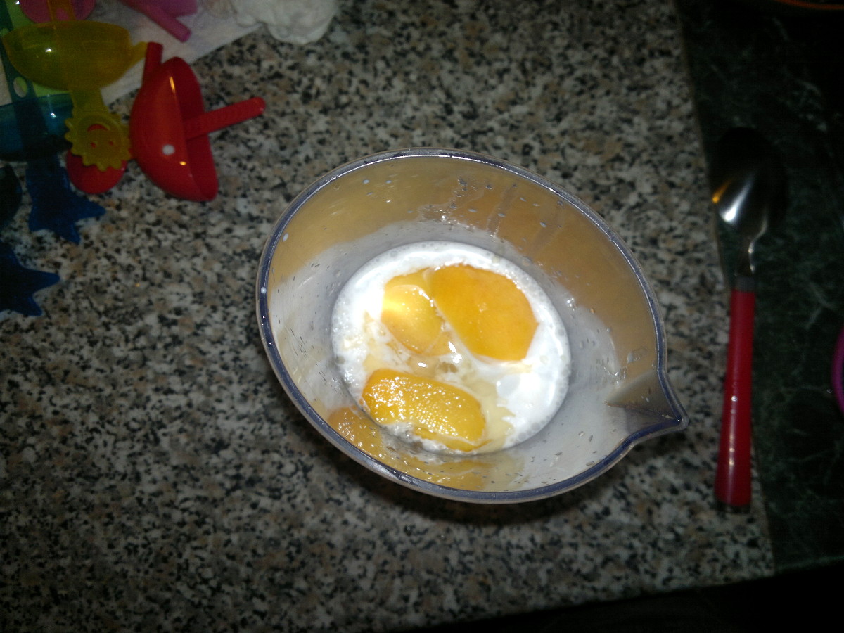 Put the peaches in the blender’s glass and add all the other ingredients. Blend with an hand blender until the mix is smooth and uniform.