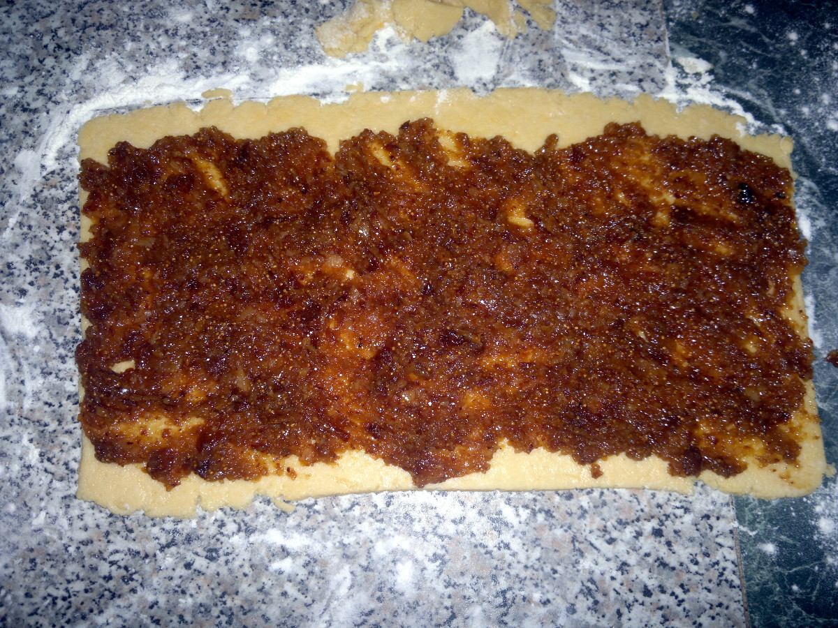 Riprendete la frolla e stendetela in un rettangolo, rifilate un po’ i bordi e spalmate il ripieno, lasciando libero circa mezzo cm su un lato lungo.