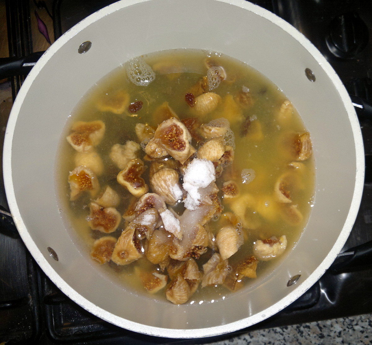 Tagliate i fichi a pezzi e metteteli in una casseruola assieme a tutti gli altri ingredienti.