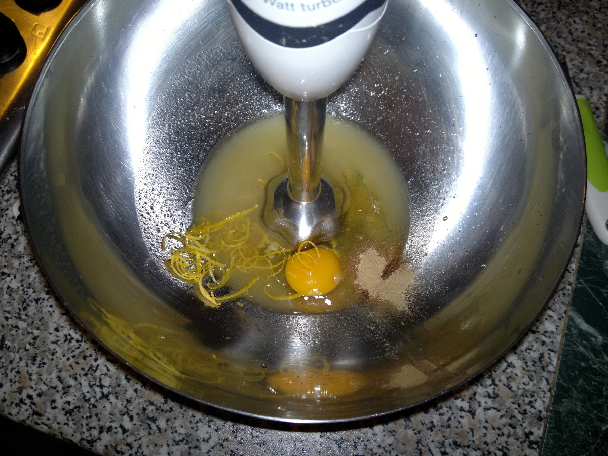 Aggiungete l’uovo, la scorza del limone, lo zenzero ed emulsionate ancora.