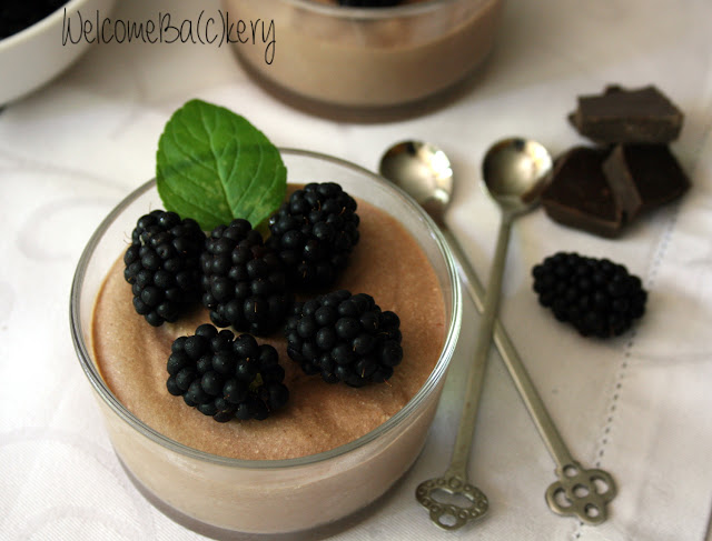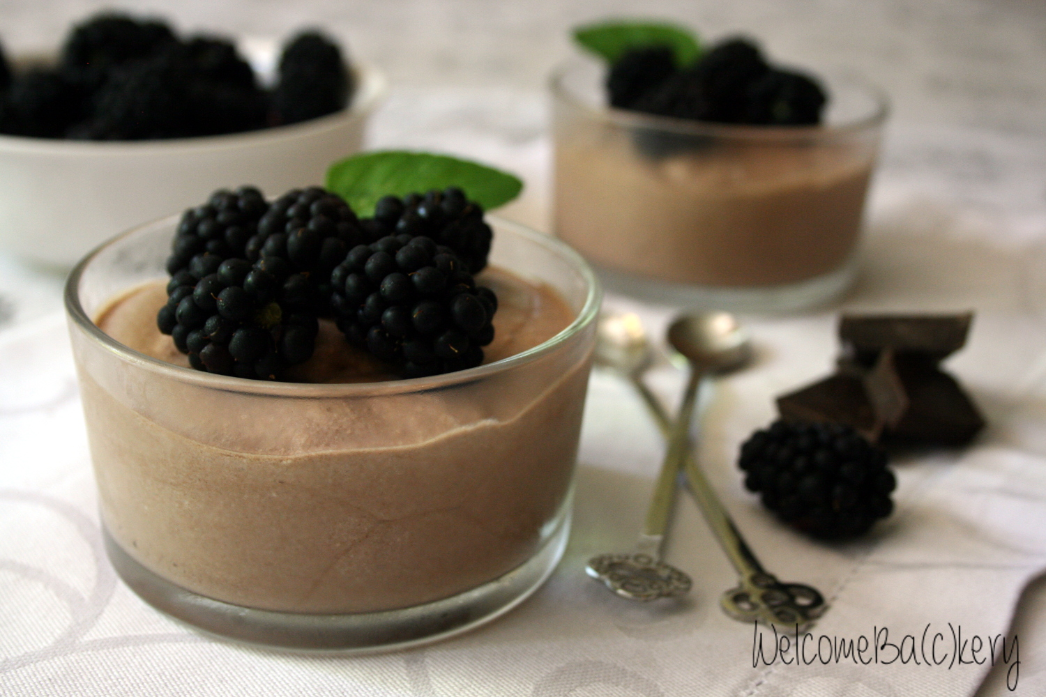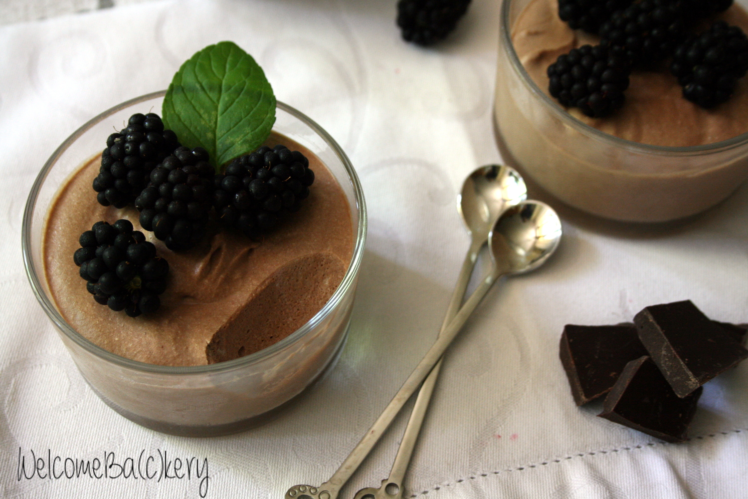 Now beat the cream until whipped and mix it to the chocolate mixture, lightly and from the bottom to the top. Divide the mousse into the glasses and set in the fridge for 6 hours. When is time to serve decorate with the blackberries and mint leaves.