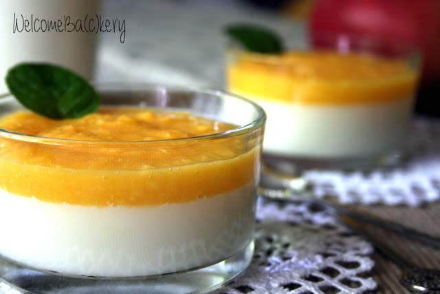 Prepare the coulis. Peel off and chop the mango, blend it with a hand-blender adding sugar and lemon juice. Distribute the coulis over the puddings and serve.