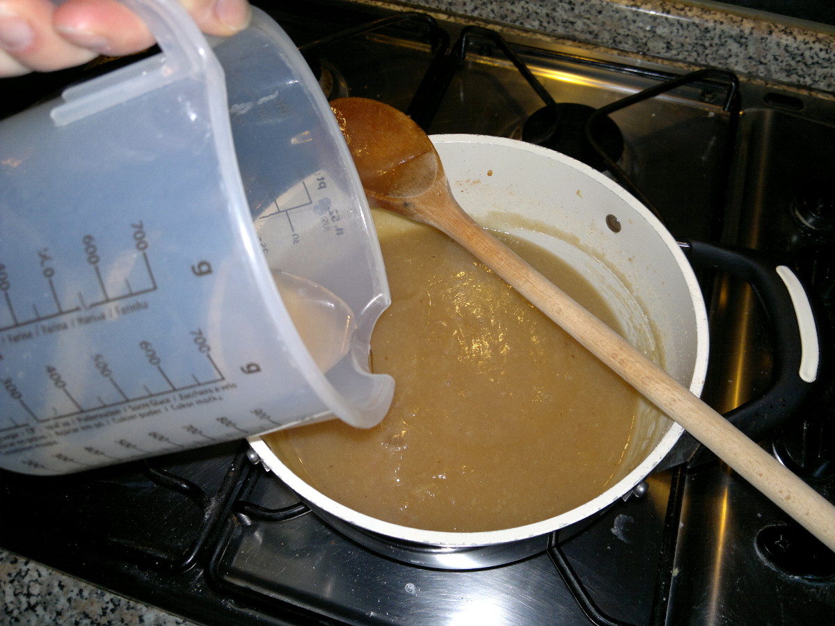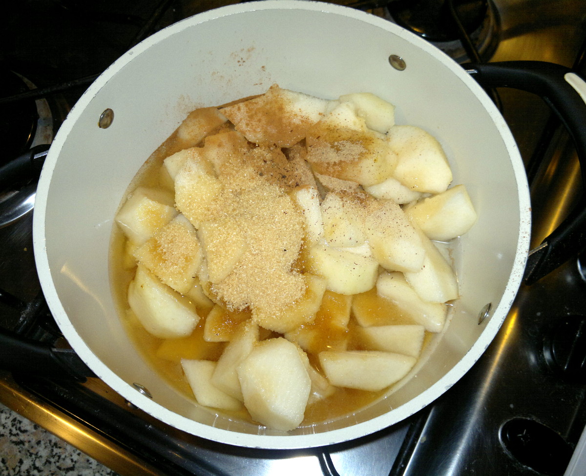 Lavate e sbucciate le pere, tagliatele a pezzi e raccoglietele in una pentola. Unite le spezie, lo zucchero di canna e il mezzo bicchiere d’acqua.