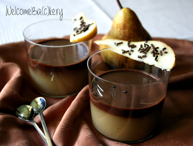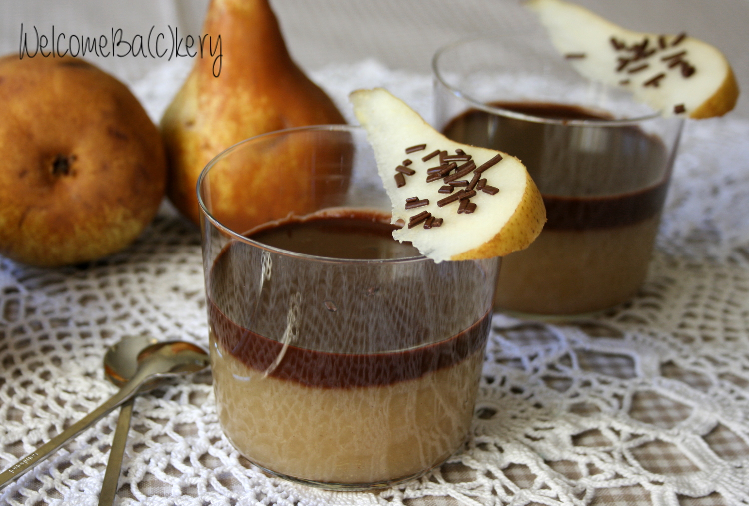 Una morbida purea di pere sovrastata da una ganache al cioccolato fondente preparata con l’acqua. Semplice e d’effetto e, tralasciando il riposo in frigo, anche veloce 🙂