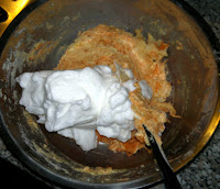 Now beat yolks with sugar until fluffy and add half lemon juice, the zests of the lemon, carrots, flour, almonds’ flour and baking. Mix lightly and add the whites, mixing gently from bottom to top.