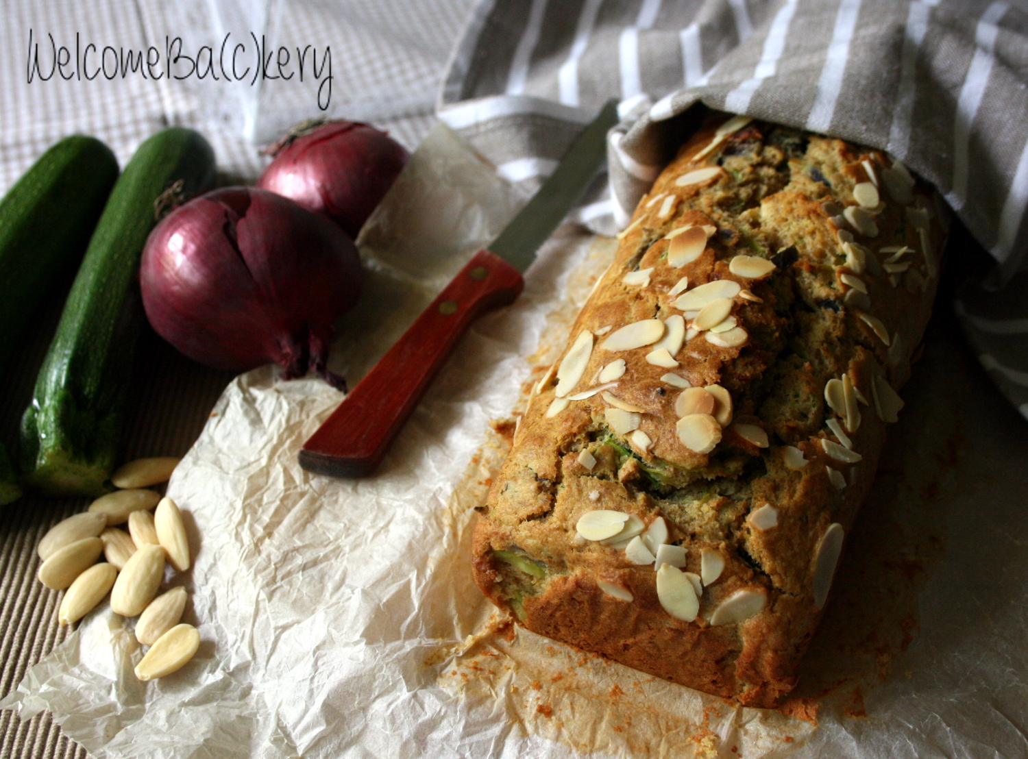 L’ultima creazione zucchinosa è stata questo cake salato, con in più le cipolle rosse e le mandorle.