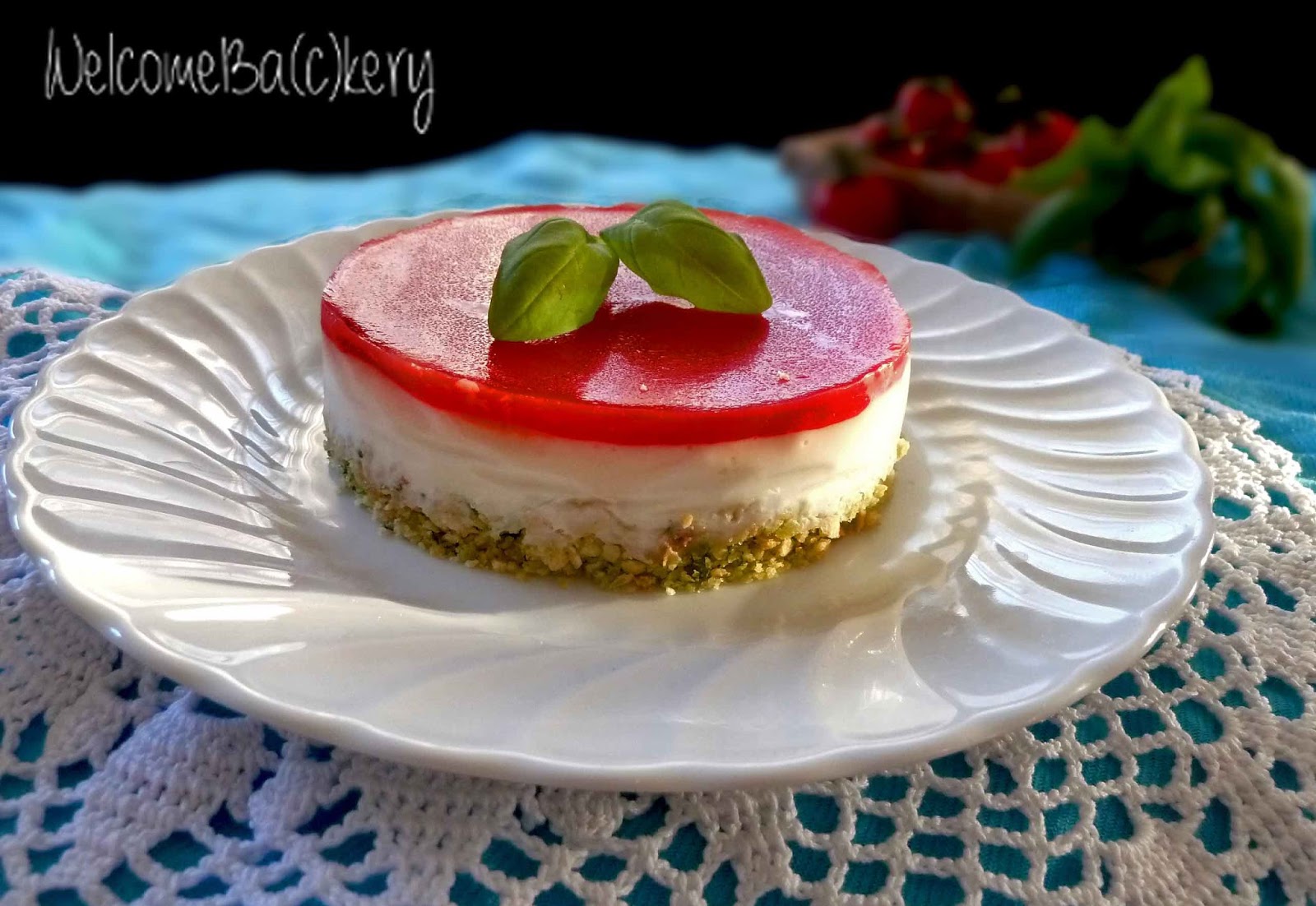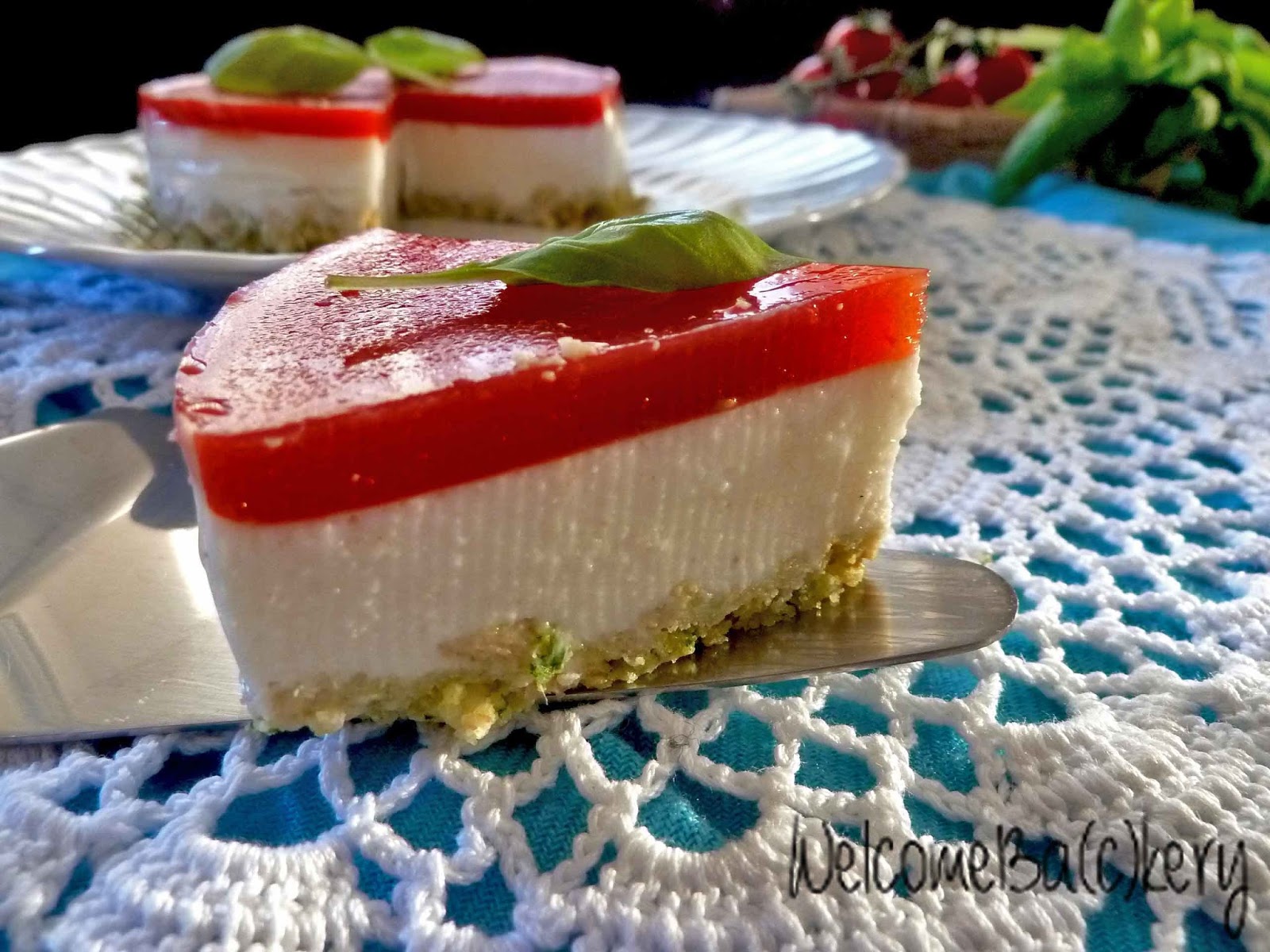 Salted cheesecake with tomatoes and basil