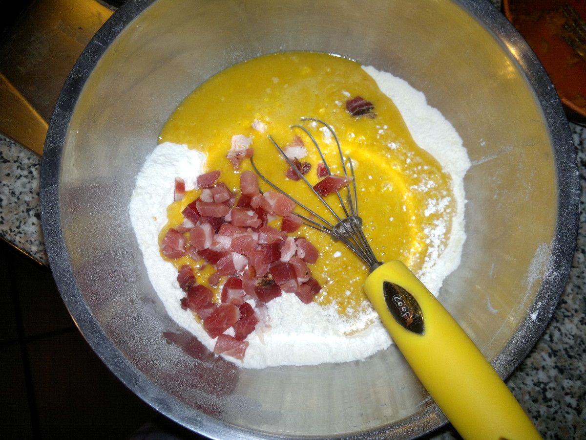 Sift in a bowl flour with baking. In another bowl mix well cooled down butter, egg, milk and pumpkin. Now pour the pumpkin mixture over flour, add salt and speck and stir just until uniform.