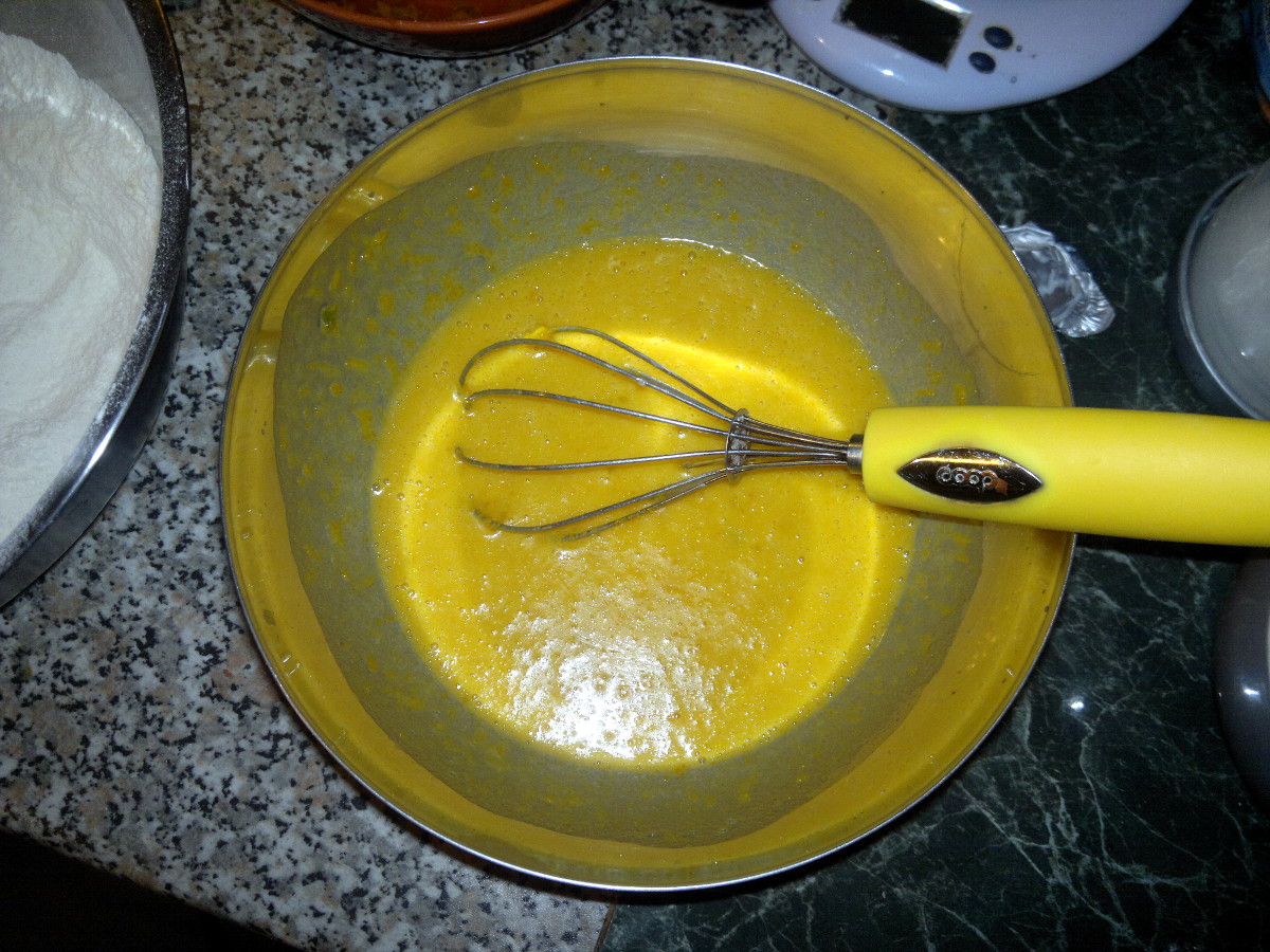 In un’altra ciotola mescolate bene il latte con il burro intiepidito, l’uovo e il purè di zucca.