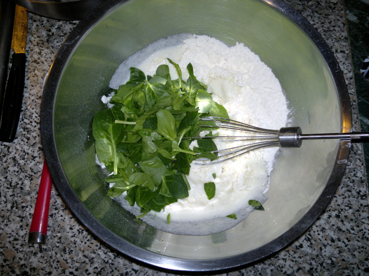Unite ora gli ingredienti liquidi a quelli secchi amalgamate un po’ ed unite gli spinacini spezzati grossolanamente con le mani.