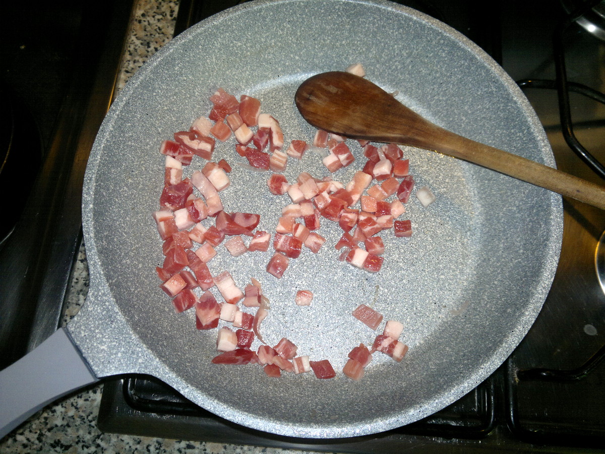 Rimettete sul fuoco la stessa padella e rosolatevi la pancetta per un paio di minuti.