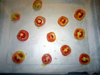 Now clean tomatoes and cut them in 7-8 mm thickness slices. Put them on the oven pan a little spaced out. Brush a little with oil, sprinkle with sugar and salt.