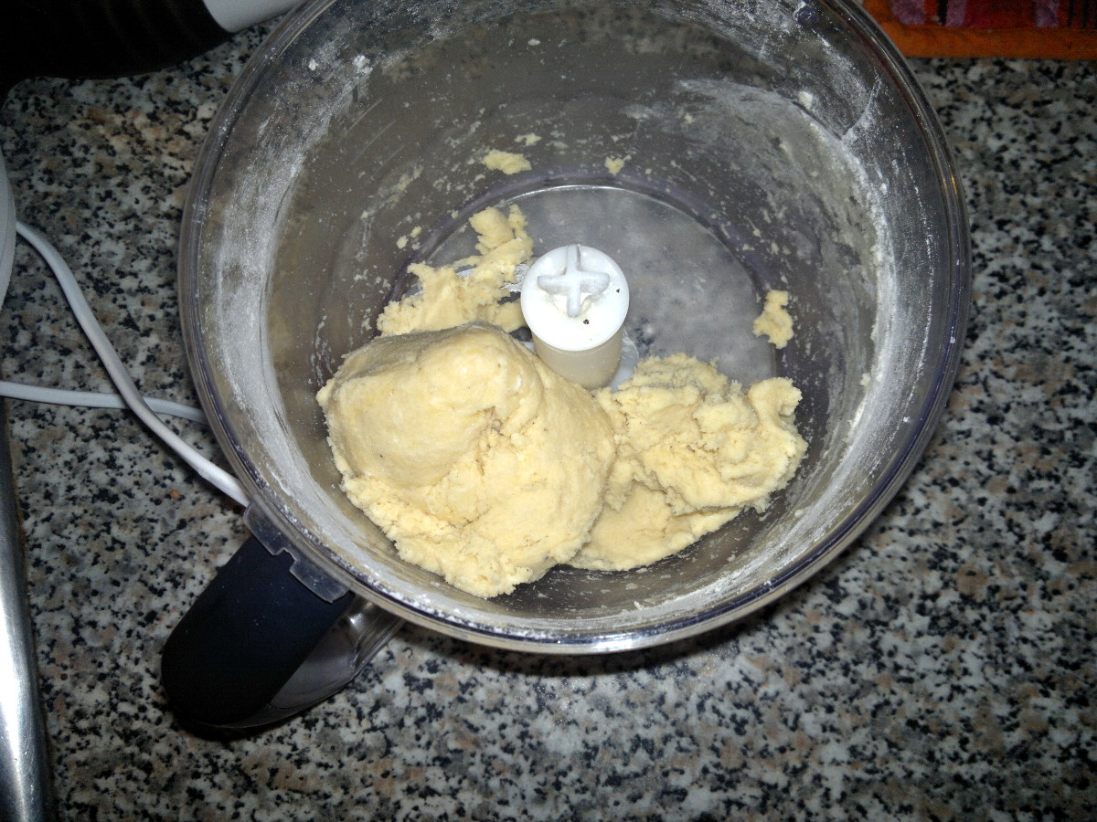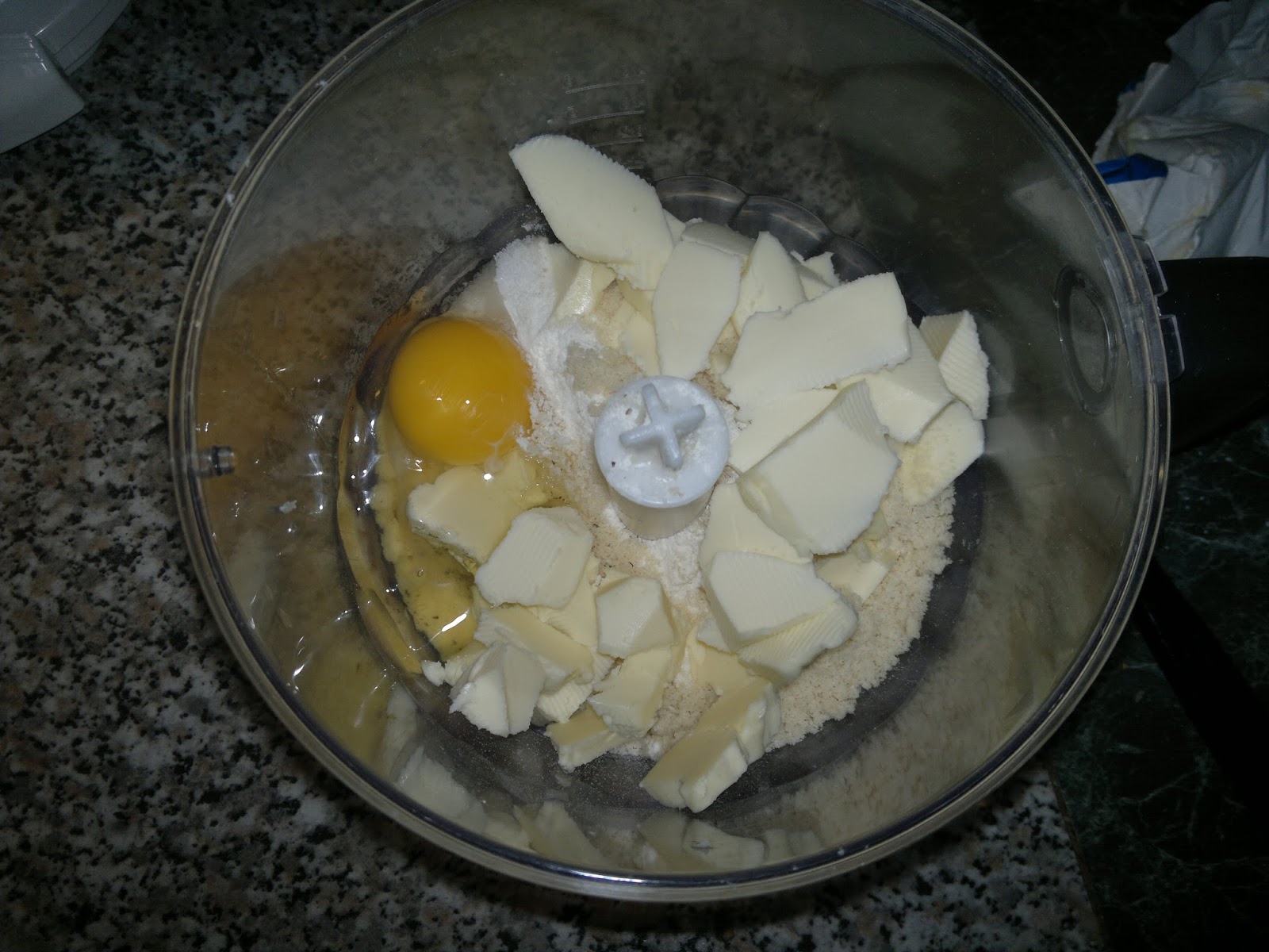 Put in the mixer 150 g of flour, almonds flour, egg, butter cut in little pieces, salt and pepper.