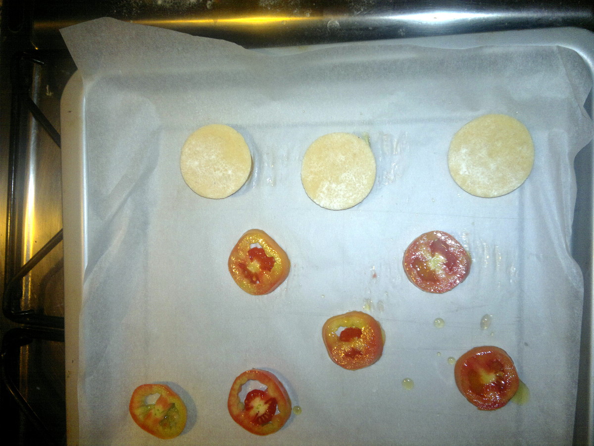 Con un tagliabiscotti ricavate tanti dischetti con un diametro leggermente maggiore delle fette di pomodoro. Adagiate ciascun dischetto sui pomodori