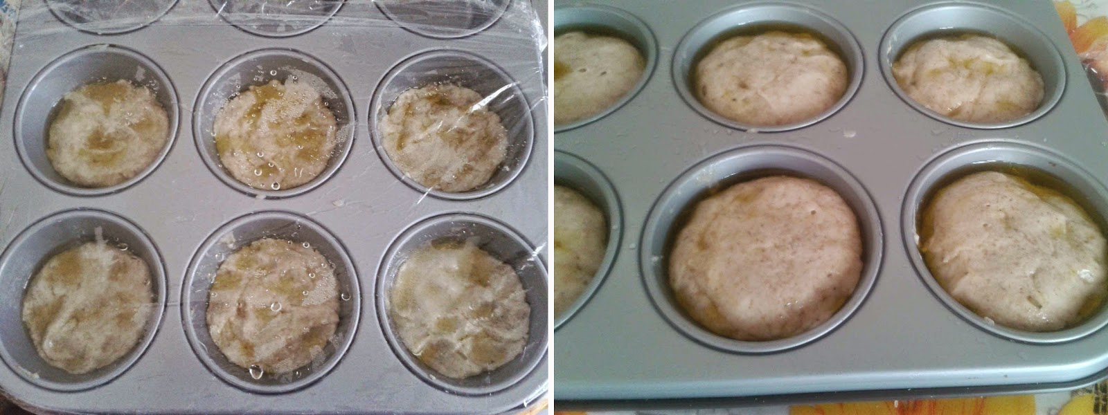 Oliare abbondantemente la teglia da muffin e versare con il cucchiaio una quantità di impasto tale da arrivare a metà stampo. Coprire con pellicola e lasciare lievitare in forno con lucina accesa fino al raddoppio.