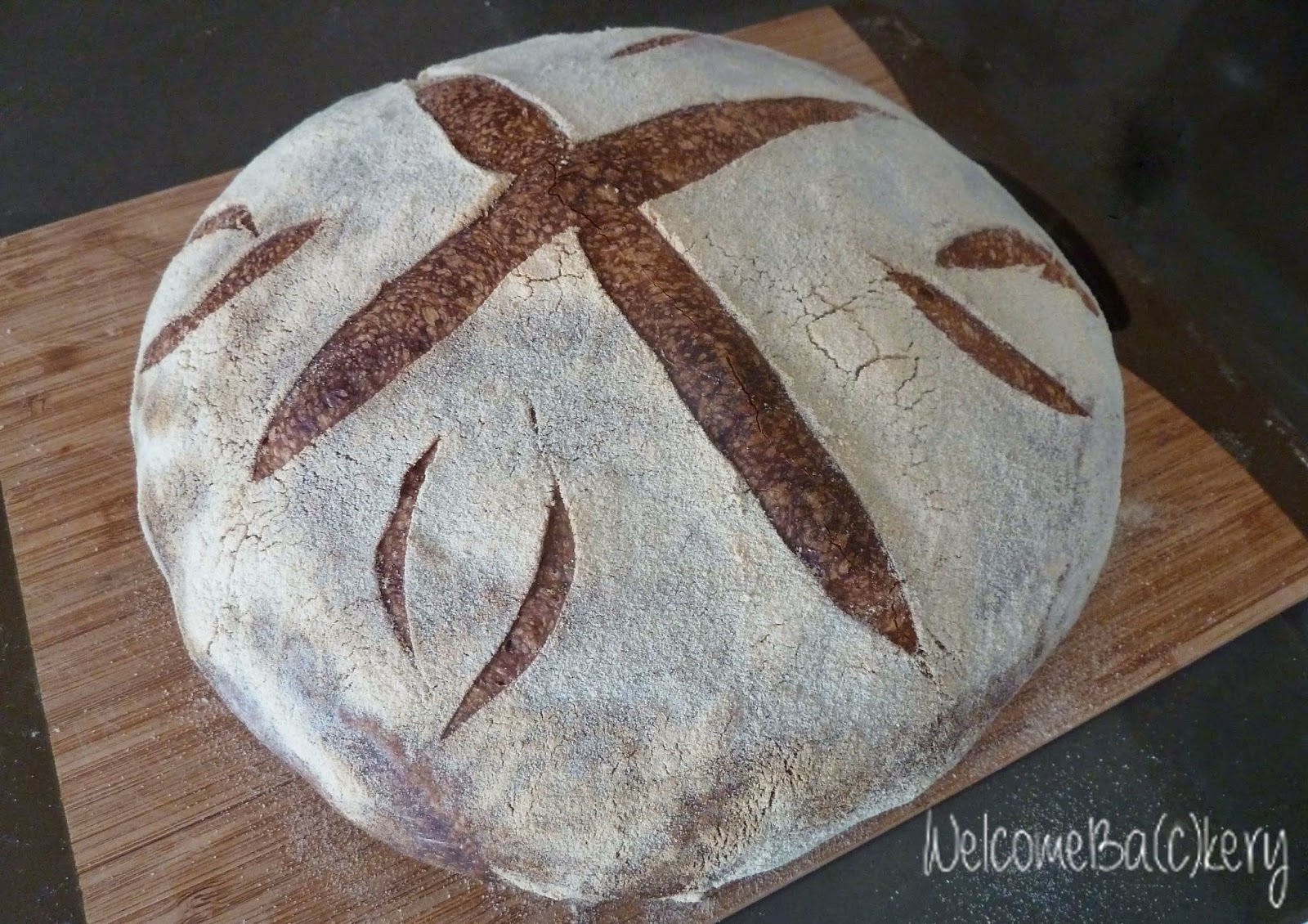 Sift the flours and proceed with autolysis with 11oz of water for 1 hour. Combine the chopped sourdough and start kneading. Gradually add the remaining water and salt. When we get a smooth, elastic dough and smooth, let it sit for 30 minutes and then proceed with two sets of three-folds, always at a distance of 30 ‘ from one another. After the last fold forming the loaf and put in a basket with cloth sprinkled with semolina. Cover and store in the refrigerator for at least 16-18 hours. After this time to double up to room temperature and bake. 482°F oven with a pan with water for the first 20 minutes, then lower to 428°F for 10 minutes and remove the Pan, then turn down to 392°F and continue cooking for another 20 minutes by opening the oven door every 5 minutes to allow the bread to dry. Finally leave the last 15 minutes with door draught and with breezy mode. Cool upright, leaning against the wall of the oven.