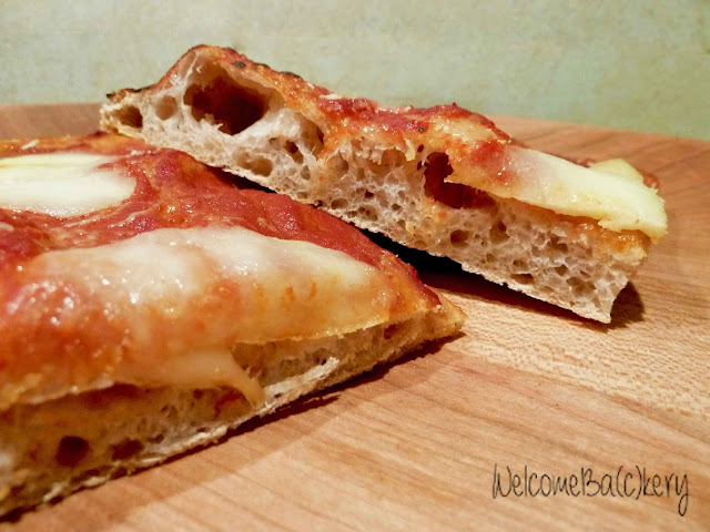 Una pizza leggerissima (nel vero senso della parola, la fetta sembrava una piuma), mollica morbida, asciutta e ariosa, base croccante. L’ispirazione l’ho presa dalla pizza in teglia imparata al corso con Raffaele Pignataro, apportando qualche piccola modifica nella scelta degli ingredienti e nel procedimento.