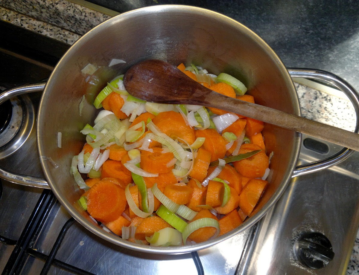 Spuntare, grattare un po’ le carote e lavarle. Tagliatele a rondelle e mettete da parte. Togliete la guaina e la parte verde del porro e affettatelo. Sbucciare e ridurre la patata a pezzetti e tritare la cipolla.