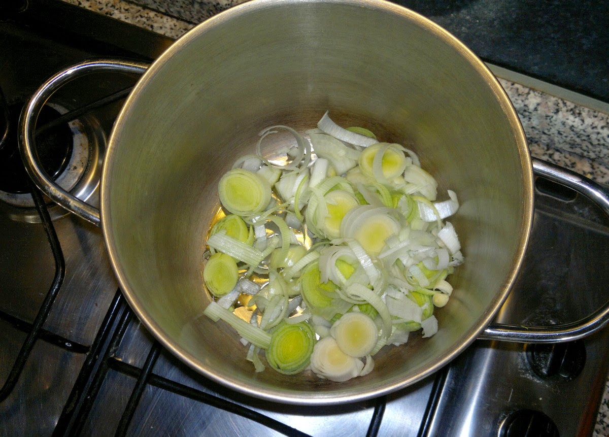 Mettere quest’ultima in una pentola con due cucchiai d’olio, il porro e l’alloro e farli rosolare.